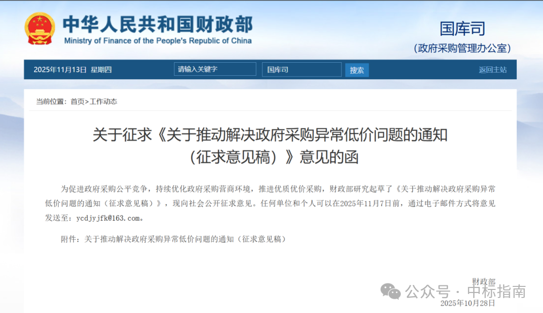 2025年10月28日,财政部发布《关于推动解决政府采购异常低价问题的通知(征求意见稿)》。文件明确:在政府采购项目中,若供应商报价低于“全部通过符合性审查供应商报价平均值×50%”或低于“次低报价×50%”,评审委员会应当启动“异常低价投标(响应)审查程序”。