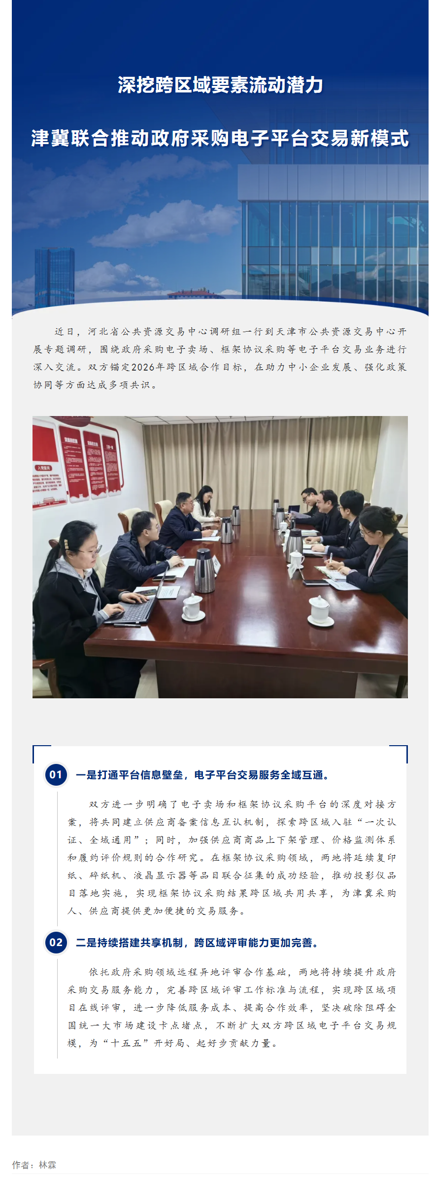 近日,河北省公共资源交易中心调研组一行到天津市公共资源交易中心开展专题调研,围绕政府采购电子卖场、框架协议采购等电子平台交易业务进行深入交流。双方锚定2026年跨区域合作目标,在助力中小企业发展、强化政策协同等方面达成多项共识。