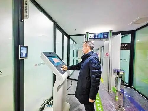 2025年12月25日,评标专家在唐山市公共资源交易中心评标区签到机前,自助核验身份开启门禁。河北日报记者王育民摄
