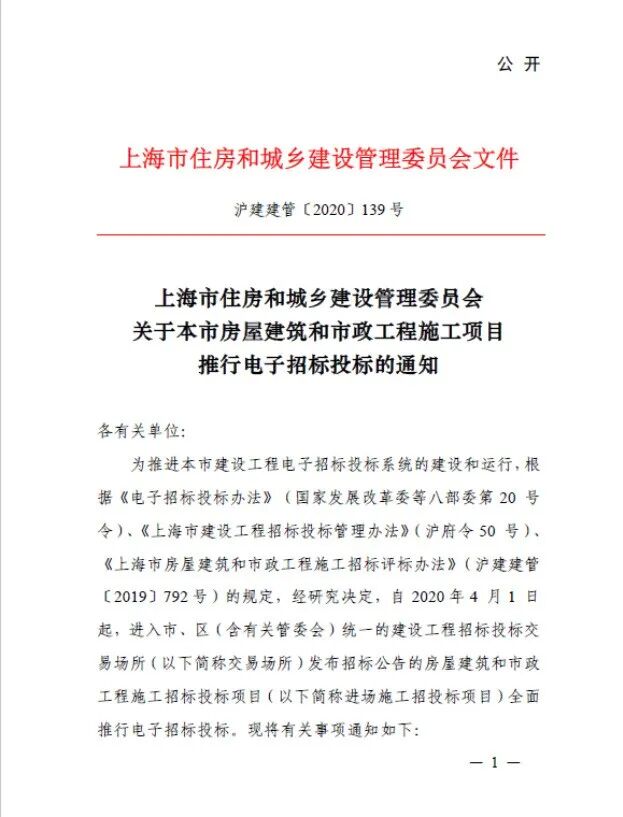 为推进本市建设工程电子招标投标系统的建设和运行,根据《电子招标投标办法》《上海市建设工程招标投标管理办法》以及《上海市房屋建筑和市政工程施工招标评标办法》(沪建建管〔2019〕792 号)的规定,市住建委发布《关于本市房屋建筑和市政工程施工项目推行电子招标投标的通知》。